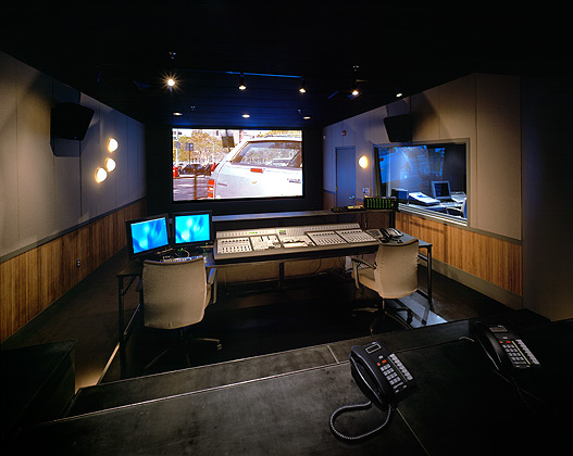 and warm gray upholstered wall panels add visual warmth and acoustic