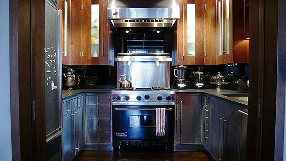 The kitchen combines custom stainless steel cabinets from a restaurant supply house, custom walnut upper cabinets, black mirror backsplash, more rice paper-laminated glass panels and the Ochs Design signature chalkboard front panel on the Subzero.