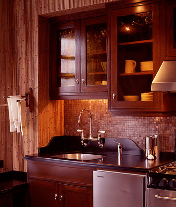 Custom mahogany cabinets adorned with jewelry box pulls, shapely stone countertops, bamboo wallpaper and an antique bamboo towel rack combine for a dramatic little kitchen