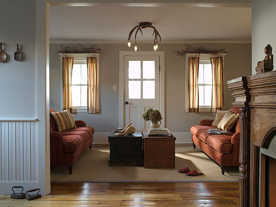 A fireplace was added to the dining room. The antler fixture in the living room beyond is an Ochs Design original.
