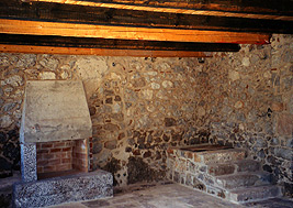 Interior surfaces retain their rustic character. Custom furniture like these large sectional sofas, while contemporary in function, were hand-carved in ways to mimic the details of antique Greek furniture.