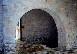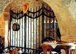This heavy stone arch in the center of the ground floor supports the floor above. Wrought iron gates safeguard stairs accessing a wine cellar below.